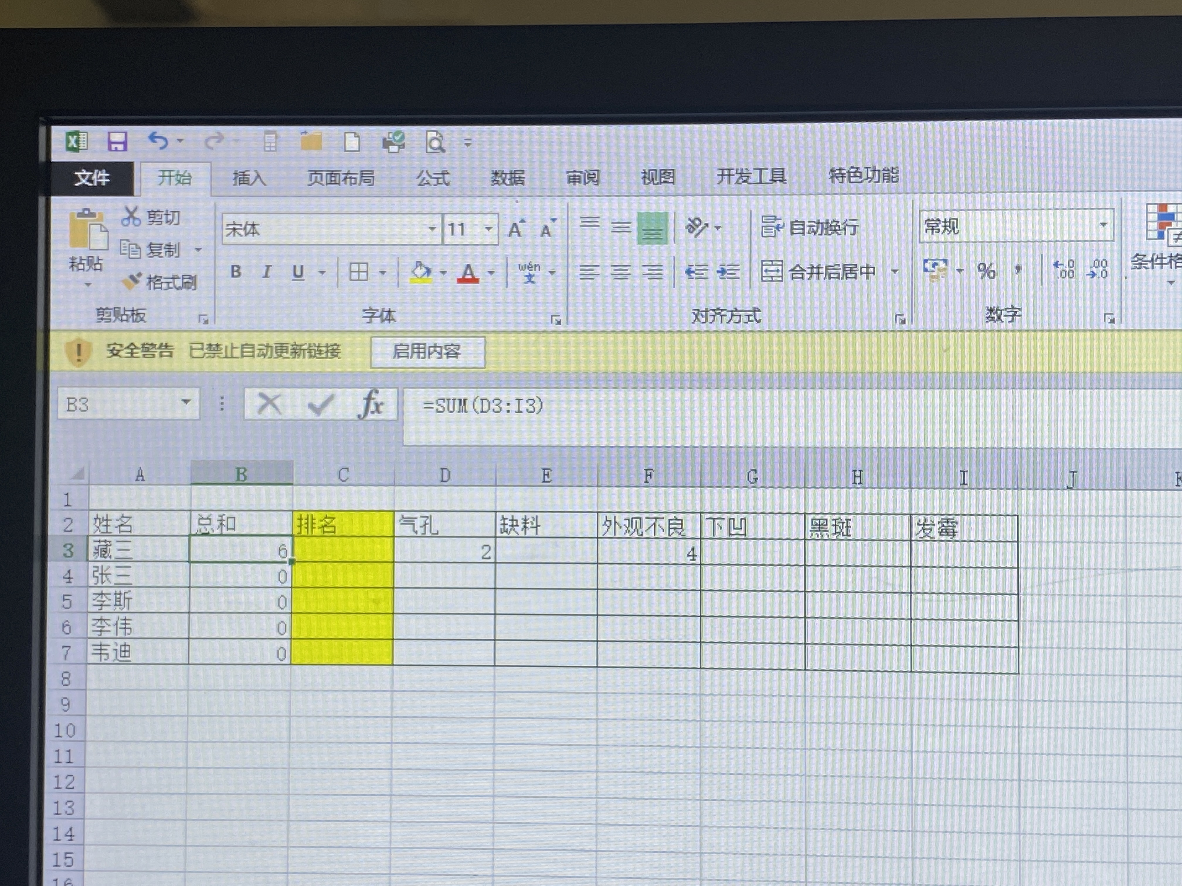 总和是用了Sum公式自动计算的,我想使黄色一行实行自动排名,总和依次从高到低该怎么做,谢谢